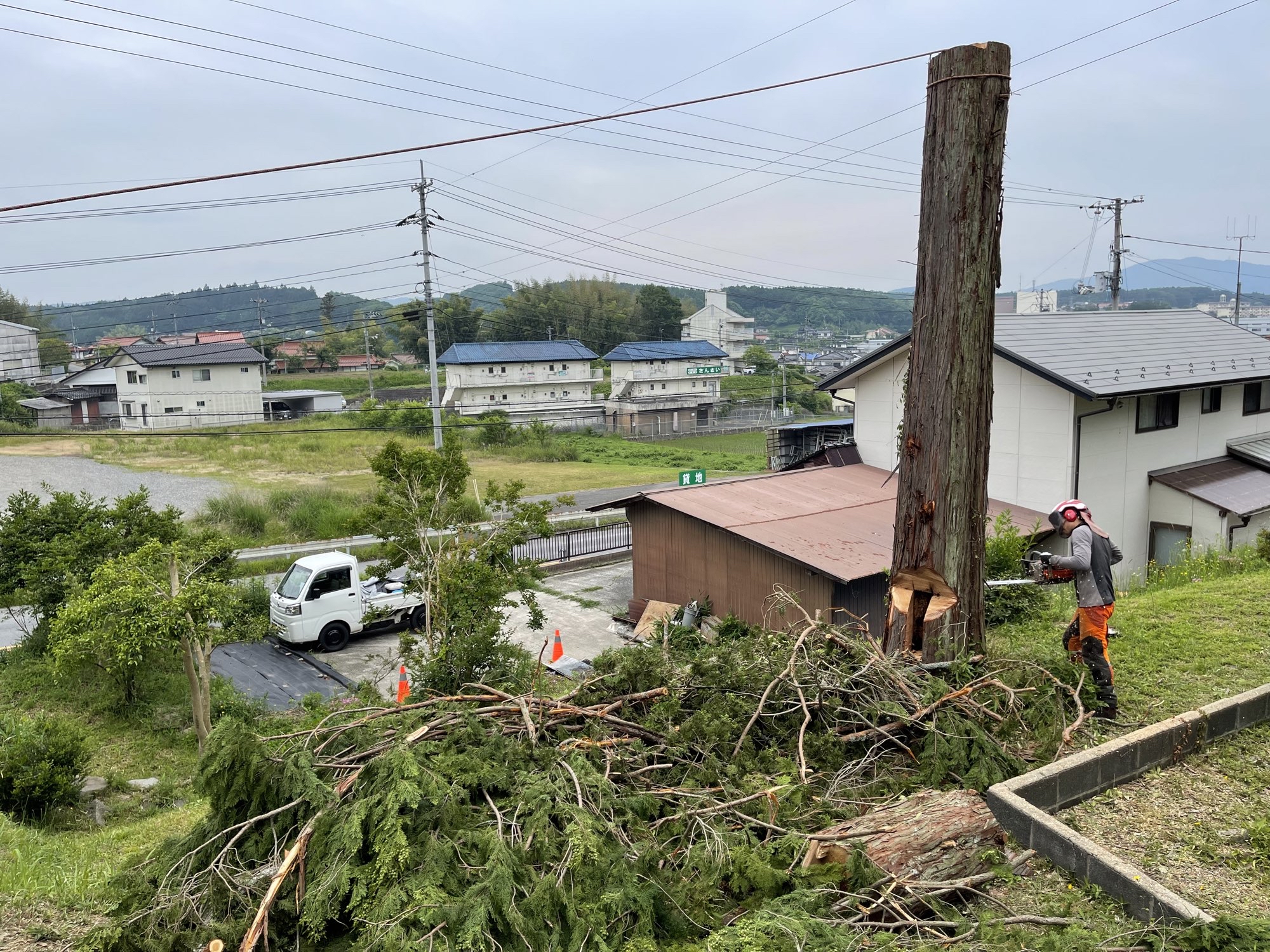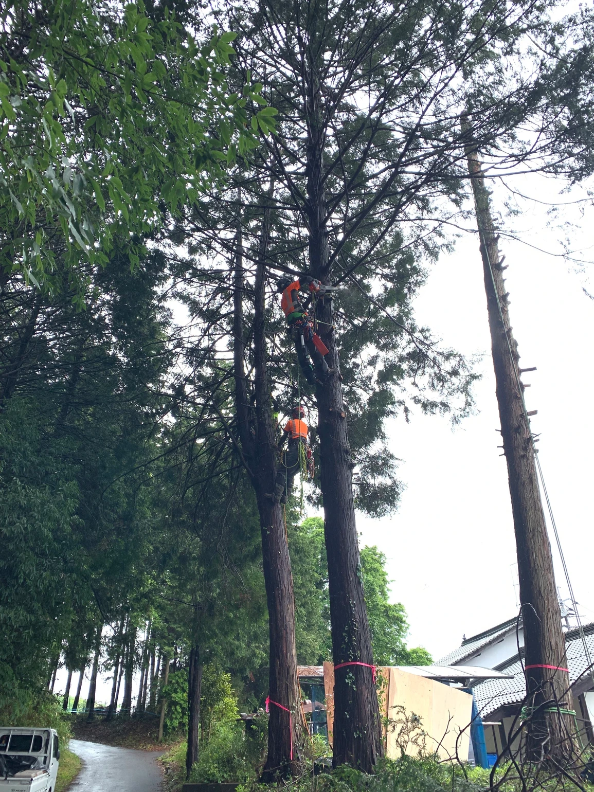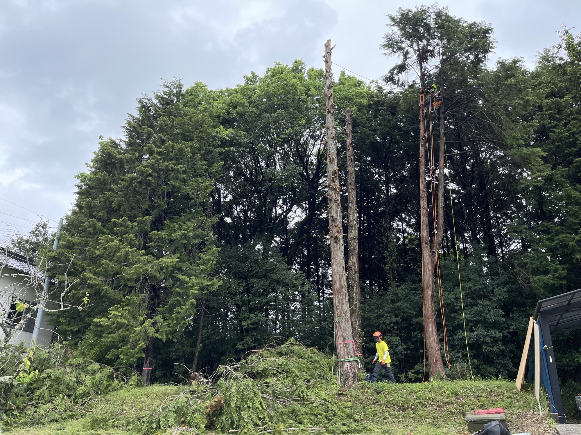周りには住宅やカーポート、横には道路、電線など素直に木を倒せない現場でした。また平均の胸高直径も45cm以上と太め。更には離れた所に1本だけあるヒノキの大きさは胸高直径60cmオーバーと大径木でした。そのまま伐倒出来ないので木に登り、上から切り詰めて低くして行きました。