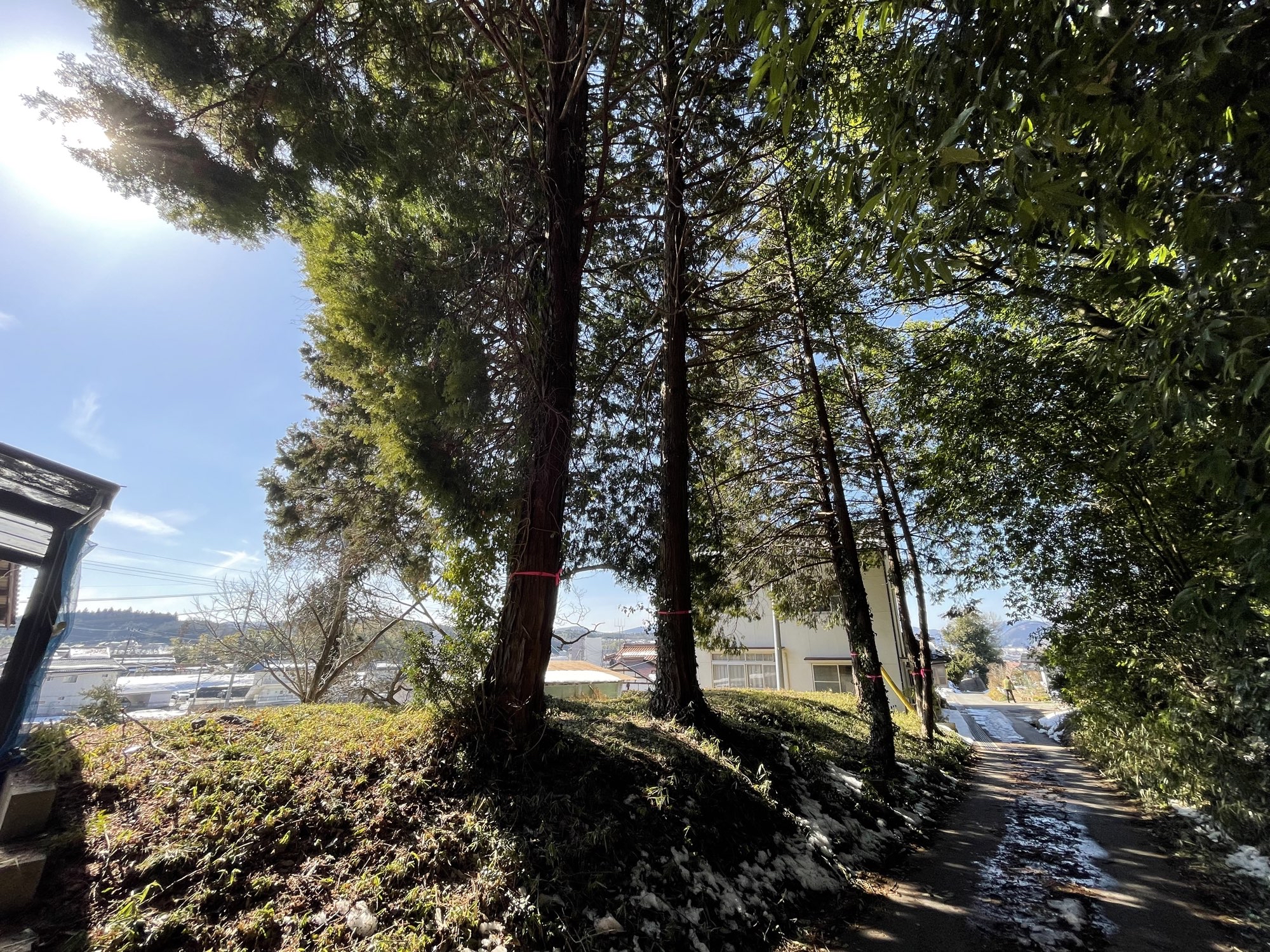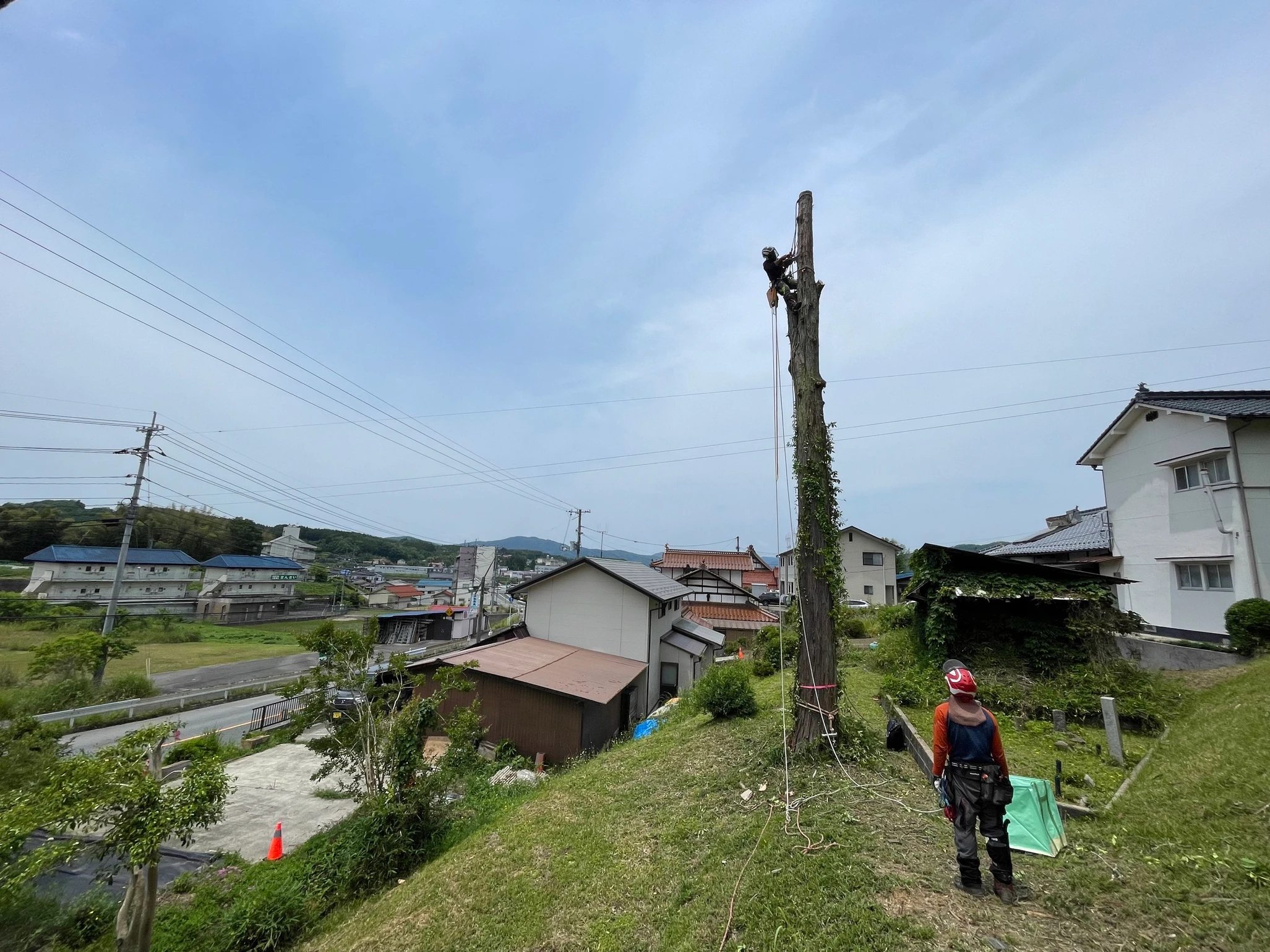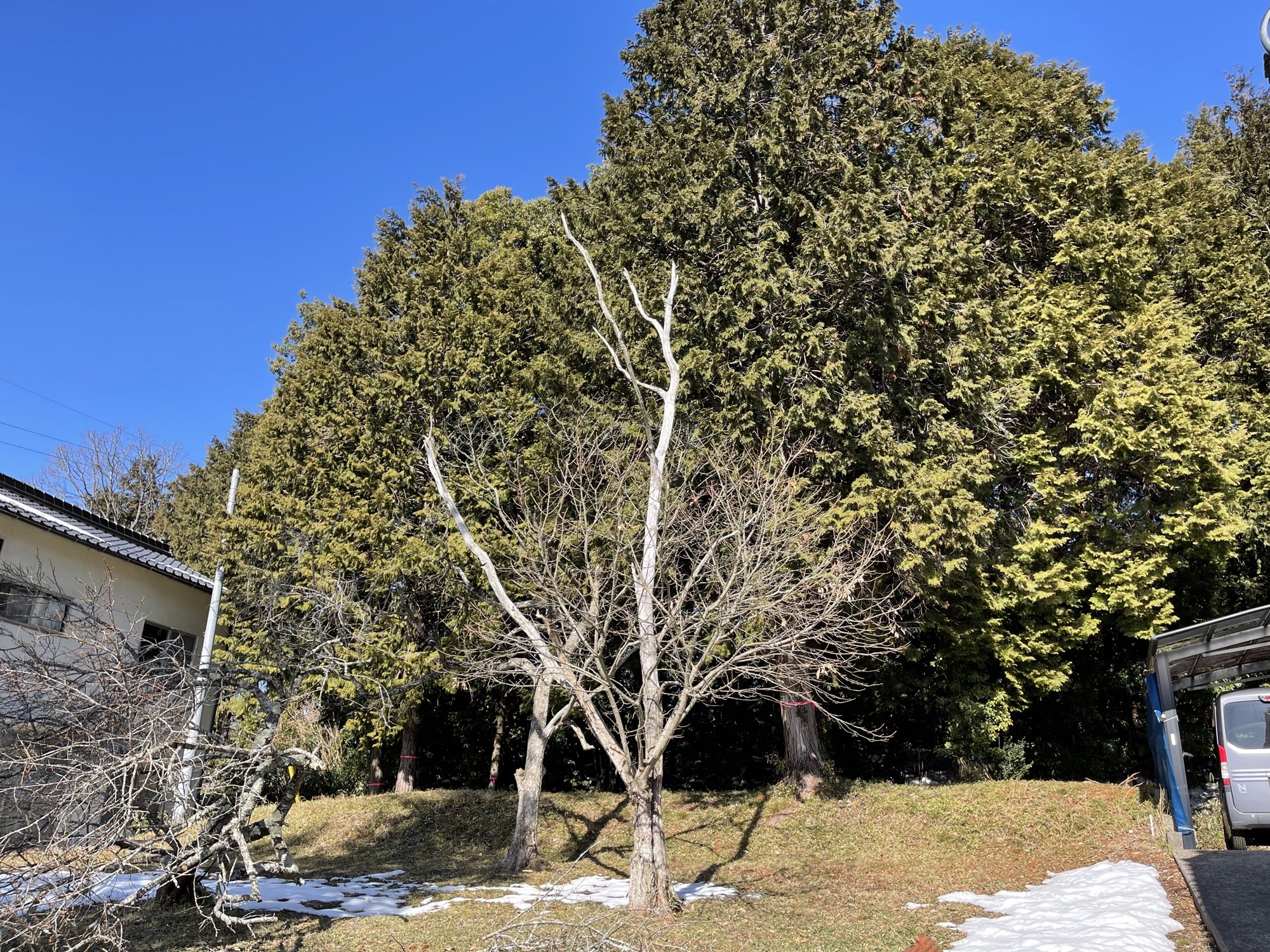 周りには住宅やカーポート、横には道路、電線など素直に木を倒せない現場でした。また平均の胸高直径も45cm以上と太め。更には離れた所に1本だけあるヒノキの大きさは胸高直径60cmオーバーと大径木でした。そのまま伐倒出来ないので木に登り、上から切り詰めて低くして行きました。